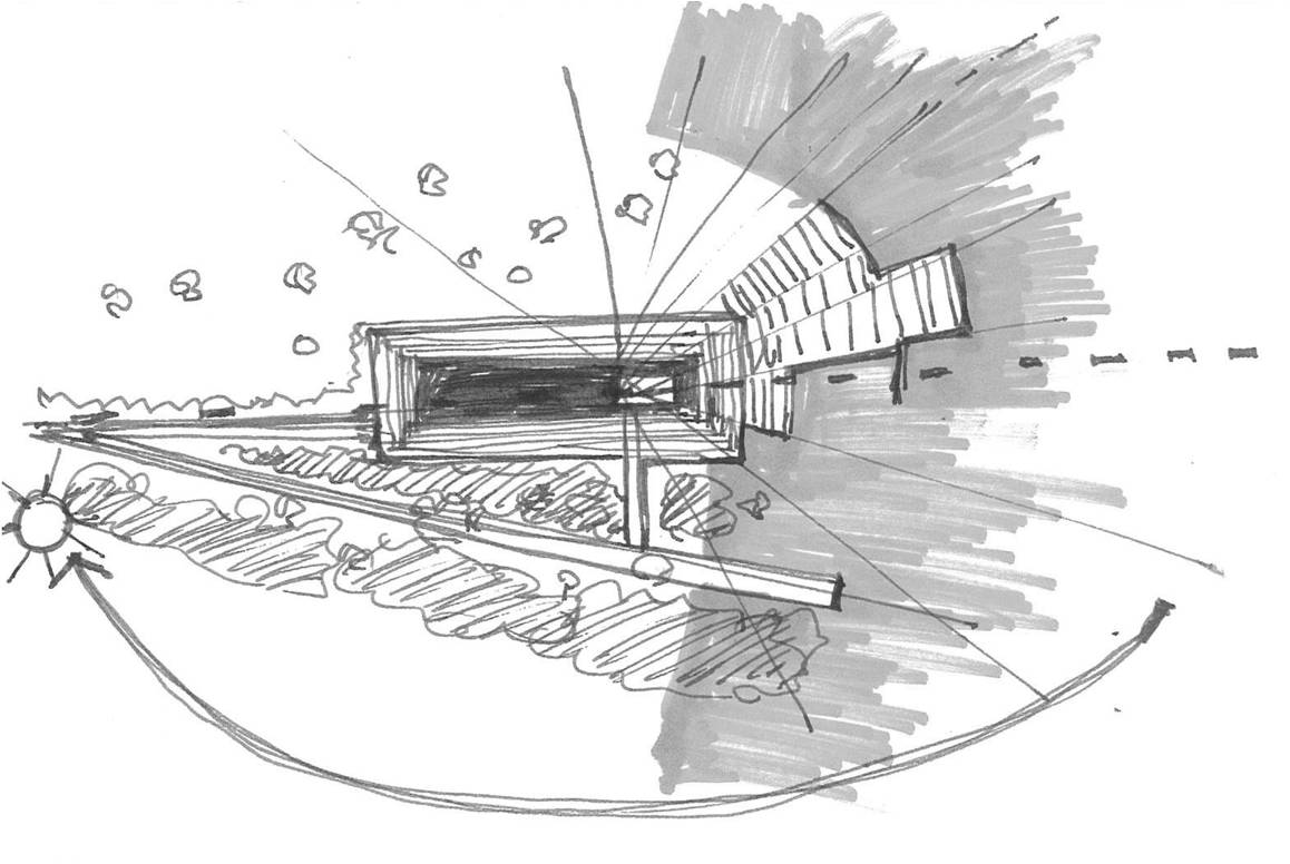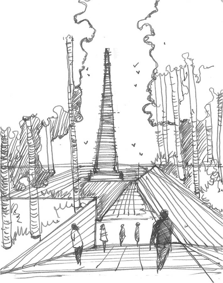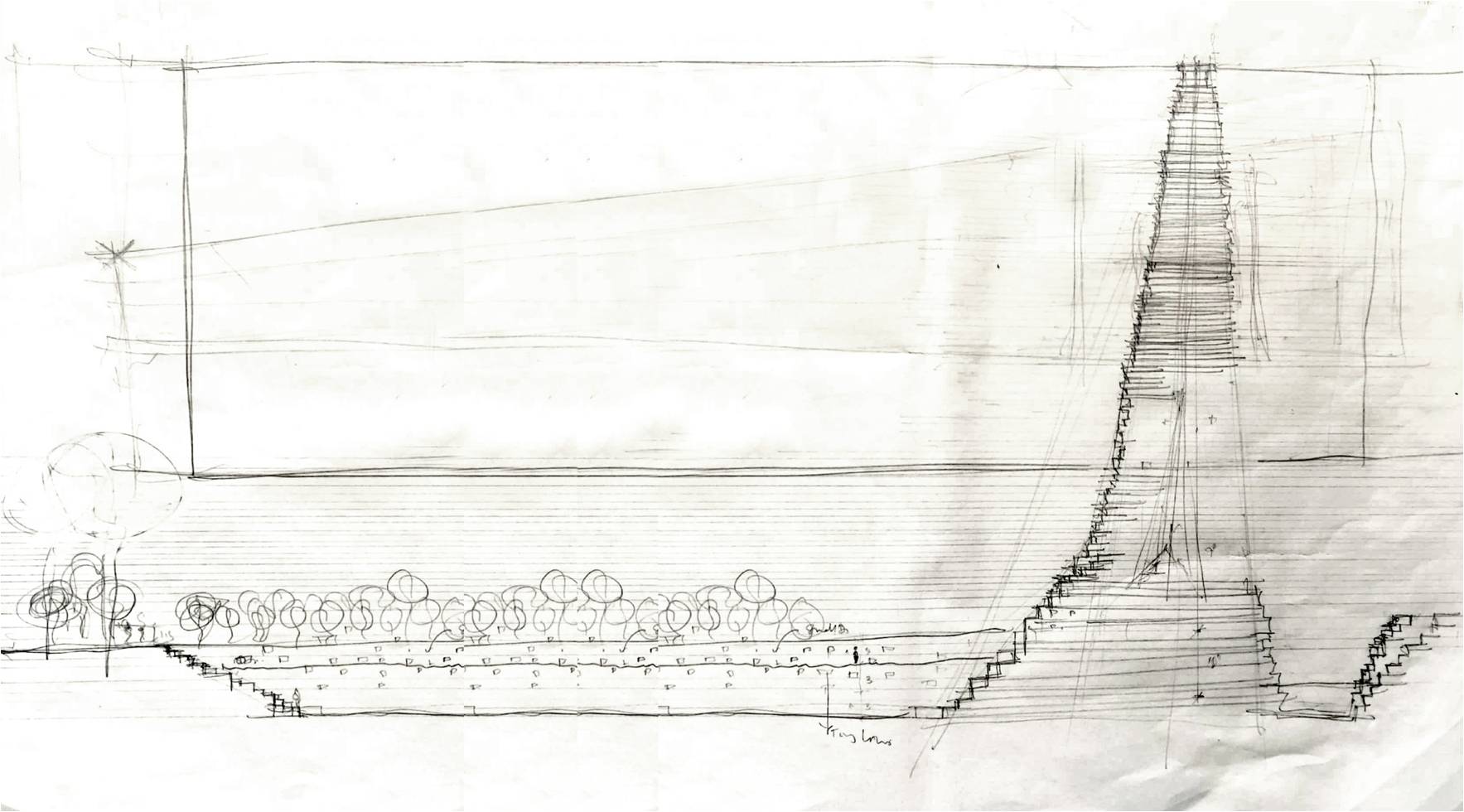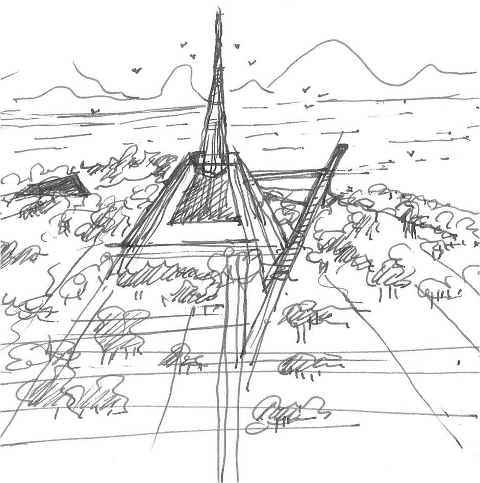 The spire of the temple sanctum is designed and scaled to ensure maximum visibility from most points in the district vicinity while the rest of the complex dissolves in nature with its boundaries blurring between the forest cover and the Hullikal lake. The primary elements that the design of the project is based on are The Sun, The Water, The Greenery and The People. The Temple Complex is oriented east to west where the shrine is facing west as per traditional beliefs. A linear spiritual pond surrounded by ghats, centrally located like a stepwell takes advantage of this orientation by catching reflections of the rising and setting sun as the pilgrims take holy dips in water.