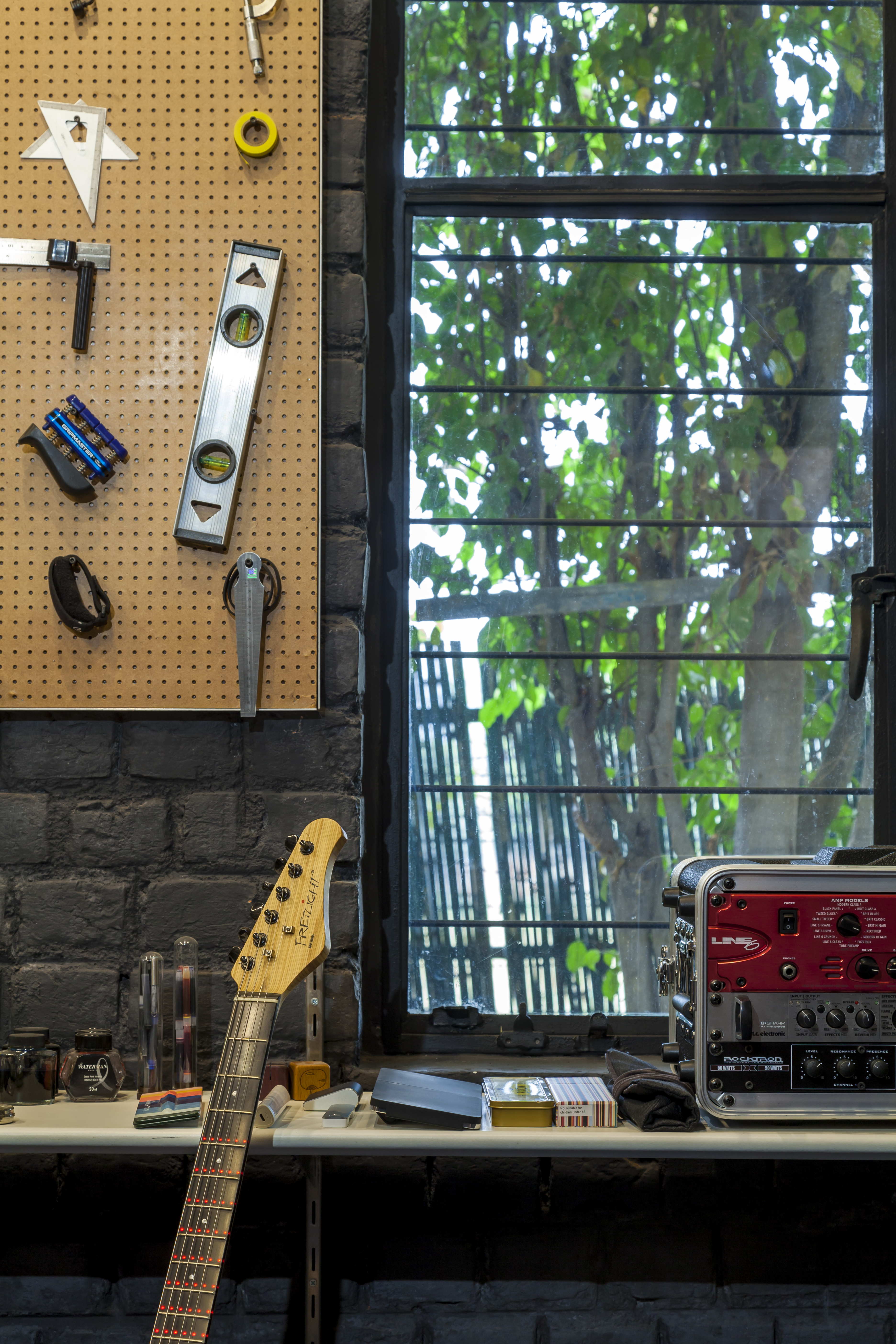 The studio offers spaces that are varying in character and volume such as the mezzanine level, music room and the break area that act as different emotive spaces. The scaffold lattice structure is another frequently used space for retreat along with the badminton court.